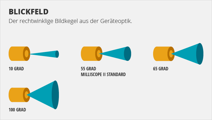 4. BlickfeldBeim Blickfeld handelt es sich um den Blickkegel von der Objektspitze aus. Je weiter das Blickfeld, desto mehr Oberfläche wird sichtbar. Zugleich geht mit einem erweiterten Blickfeld aber oft auch ein Mangel an Details einher, was die Vergrößerung einschränkt. Je weiter sich das untersuchte Objekt vom Gerät entfernt, desto geringer wird meist auch der Winkel des Blickfelds, was die Vergrößerung und die Bildqualität verbessert.