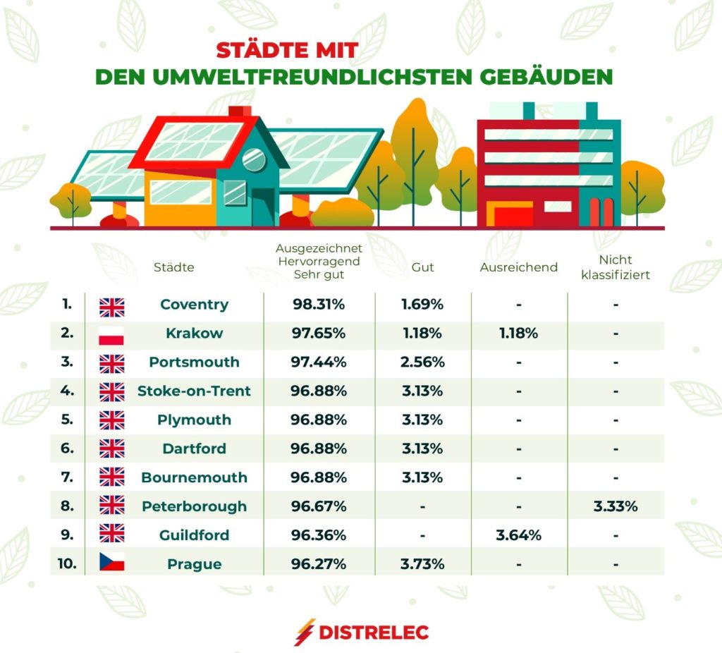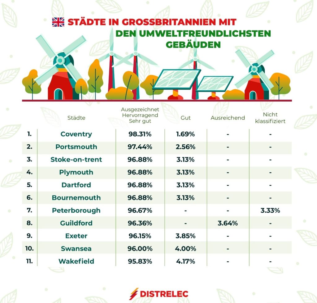 Die Stadt Exeter im Südwesten von England befindet sich am unteren Ende der Liste. Jedoch fallen immer noch lobenswerte 96,15 % der Gebäude in die beste Kategorie, während 3,85 % als gut eingestuft werden. In diesem Frühjahr soll in der Ringswell Avenue in Exeter ein neues umweltfreundliches Projekt mit Schwerpunkt auf kohlenstoffarmen Immobilien fertig gestellt werden. Auch in Wakefield, im Norden von England, sollen im Laufe des nächsten Jahres 175 umweltfreundliche Gebäude entstehen.