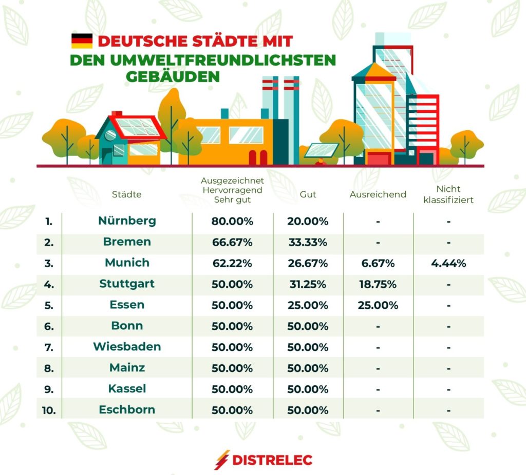 Weiter unten in unserer Tabelle steht die Stadt Essen, die 2017 zur „Grünen Hauptstadt Europas“ gewählt wurde. Mit 50 % der Gebäude in den Kategorien „Ausgezeichnet“, „Hervorragend“ und „Sehr gut“ sowie 25 % in der Kategorie „Gut“ ist die Stadt aufgrund der vielen Grünflächen und Wälder auch eine der grünsten im Verhältnis zur Fläche.