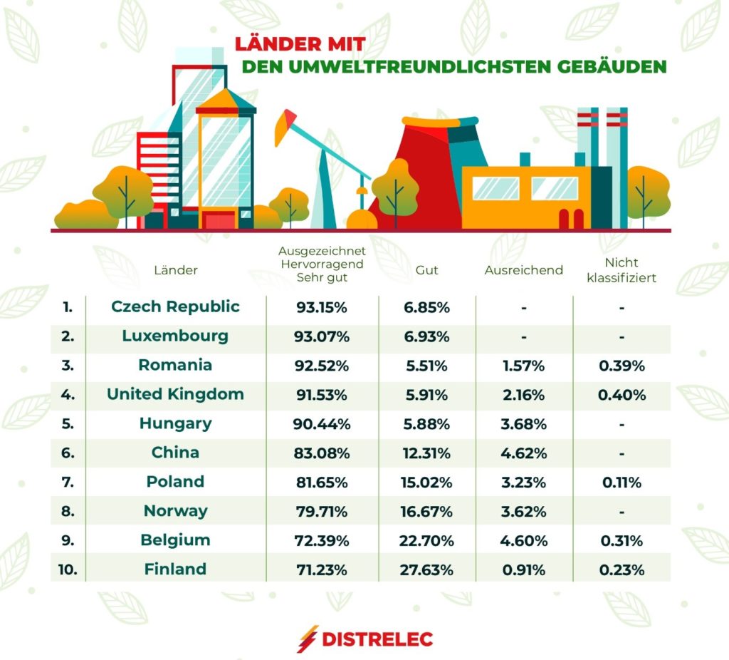 Bei so vielen englischen Orten, die in der Rangliste so weit oben stehen, sollte man meinen, dass das Vereinigte Königreich die Liste der Länder mit den umweltfreundlichsten Gebäuden im Rahmen der BREEAMS-Bewertungen leicht anführen würde. Doch obwohl das Land insgesamt beeindruckend abschneidet und 91,53 % der Gebäude in die Spitzengruppe fallen, schafft es nur den vierten Platz. Die Tschechische Republik konnte mit 93,15 % den ersten Platz erobern. Vielleicht noch schockierender ist, dass 0,40 % der Gebäude im Vereinigten Königreich bei der BREEAM-Bewertung als nicht klassifiziert eingestuft wurden.