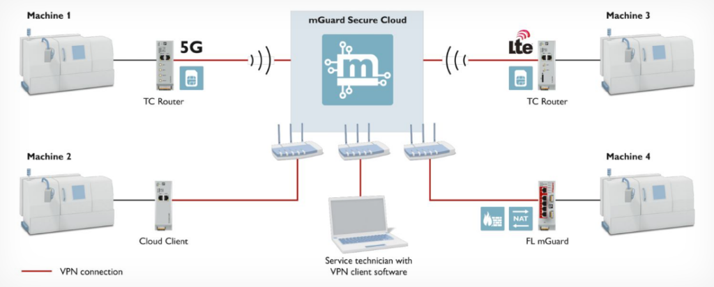 Phoenix Contact ist ein global agierender Anbieter von industriellen Elektronikkomponenten und -lösungen. Seine mGuard Secure Cloud ist eine sofort einsatzbereite Lösung für Unternehmen mit dem Wunsch nach einem intelligenten, nachhaltigen Servicemodell. Sie eignet sich insbesondere für die Wartung einzelner Computer oder kleiner IP-Netzwerke. Die zuverlässigen VPN-Verbindungen entstehen durch Industrierouter und sichere VPN-Clients.