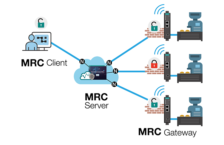 In Industrieanwendungen überzeugt MRC als anwenderfreundliche, sichere und anpassbare Netzwerklösung mit stabilen Verbindungen zwischen Anlagen, Technikerausrüstung und Anwendungsservern. Zu einem solchen System gehören MRC-Server, MRC-Gateways und MRC-Clients. „MRC Server“ ist die Plattform, auf der die Verbindung zwischen MRC-Gateways und -Clients hergestellt wird. Remote-Standorte mit ethernetfähigen Geräten können sich über das sichere MRC-Gateway mit dem MRC-Client verbinden. Die Software „MRC Client“ wird auf Service-Laptops installiert und ermöglicht Technikern die Fernverbindung zu den Geräten ihrer Wahl.