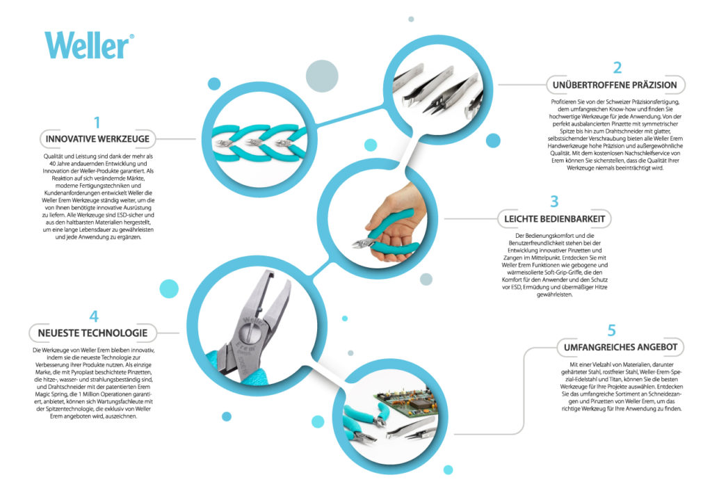 Die Werkzeuge von Weller Erem eignen sich ideal für Wartungstechniker, die zur Maximierung der Effizienz höchste Präzision und Qualität benötigen. Mit einem umfangreichen Sortiment an handgefertigten, in der Schweiz hergestellten Pinzetten und Schneidezangen bietet Weller Erem Handwerkzeuge an, die mit innovativen Funktionen erweitert werden, um Ihren Bedürfnissen gerecht zu werden. Zu den Spitzentechnologien, die exklusiv für diese Marke erhältlich sind, gehören hitze-, wasser- und strahlungsbeständige, pyroplastbeschichtete Pinzetten und Drahtschneider mit Erem Magic Spring, die 1 Million Schneidvorgänge garantieren.