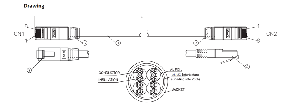 • Komplettabschirmung Aluminium-Verbundfolie mit zusätzlichem Schirmgeflecht (gilt nur für S/FTP-Patchkabel)