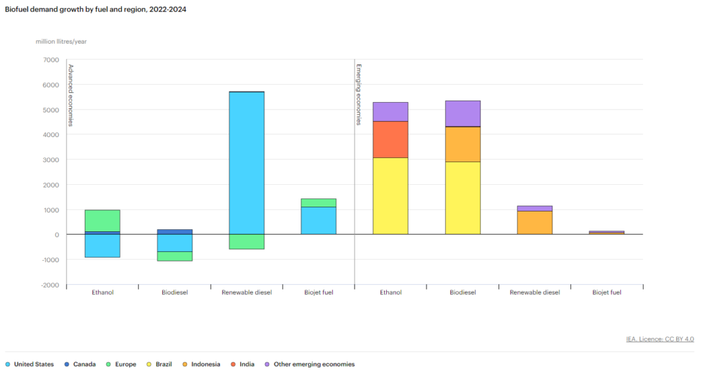 Biofuel demand growth by fuel and region, 2022-2024. Source: IEA 2024; Will energy security concerns drive biofuel growth in 2023 and 2024? – Renewable Energy Market Update – June 2023 – Analysis – IEA, Licence: CC BY 4.0.