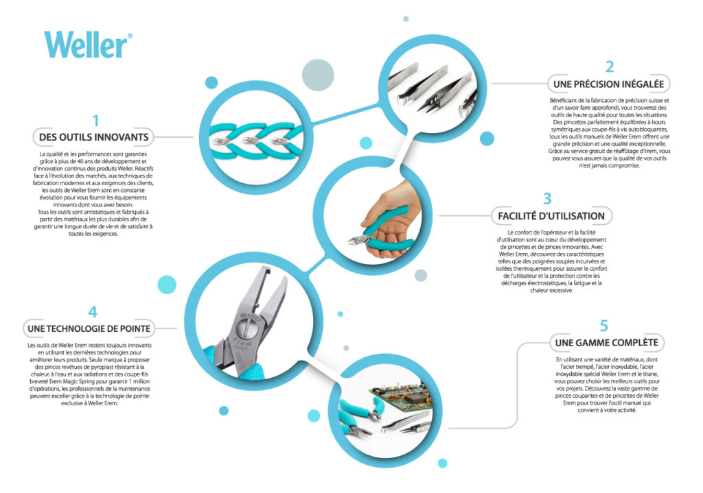 Les outils Weller Erem sont idéaux pour les techniciens de maintenance qui exigent une précision et une qualité supérieure afin de maximiser l’efficacité. Avec une vaste gamme de pinces et de pinces coupantes fabriquées à la main et d’origine suisse, Weller Erem propose des outils à main enrichis de caractéristiques innovantes pour répondre à vos besoins. Les technologies de pointe exclusives à cette marque comprennent des pinces et des coupe-fils recouverts de pyroplast résistant à la chaleur, à l’eau et aux radiations et doté d’Erem Magic Spring pour garantir 1 million d’actions de coupe.