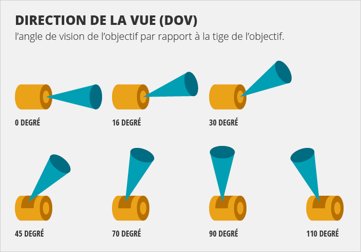 La direction de la vue (direction of view, DOV) décrit la vue d’un appareil depuis l’axe longitudinal à travers la sonde de l’objectif. Spécifiée en degrés, elle peut être fixe ou variable, et potentiellement adaptée à l’aide d’un adaptateur d’embout interchangeable.