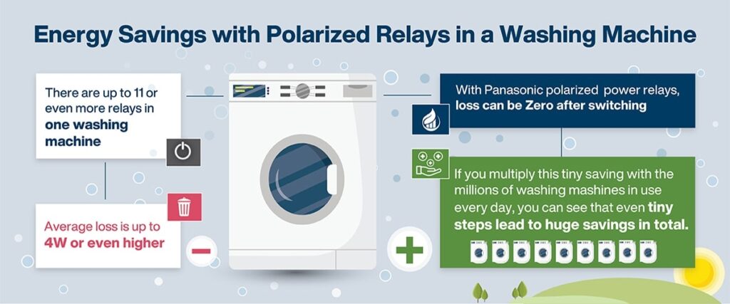 A Panasonic 50 éve találta fel a polarizált relét. Állandó mágnest alkalmaznak a tekercs mágneses erejének növelésére, így kevesebb elektromos energiát igényel az érintkezők kapcsolása. Az energiahatékony polarizált relék a Panasonic becslése szerint 1960-as évekbeli feltalálásuk óta 3 milliárd kWh energiát takarítottak meg Európában. A következő tíz évben az okosotthonok, okosirodák, okosgyárak és okosvárosok irányába történő elmozdulás során ez jelentősen növekedni fog.