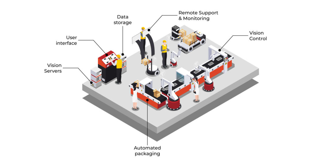In any modern factory, computer-based vision processing can be found employed in a variety of different applications. Computer vision relies on the use of one or more video cameras attached to a computer system. The nature of the task will determine the complexity of the processing involved and the compute resources required. For example, an application accepting or rejecting bottles based on how accurately a label has been affixed might not require multiple cameras and intensive compute resources. An algorithm that detects the edges of the label within a pre-defined area on the bottle is relatively straightforward using software based Kalman filters. However, an application that needs to differentiate the limbs of a hydraulic press operator from the metal panels being processed and the equipment itself is more involved.