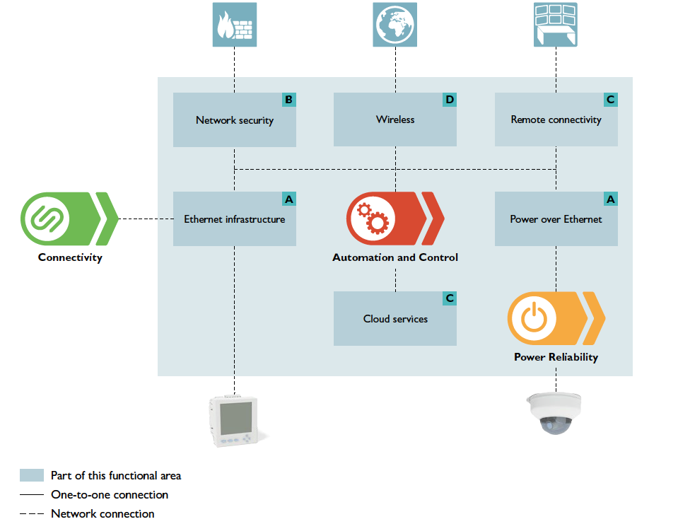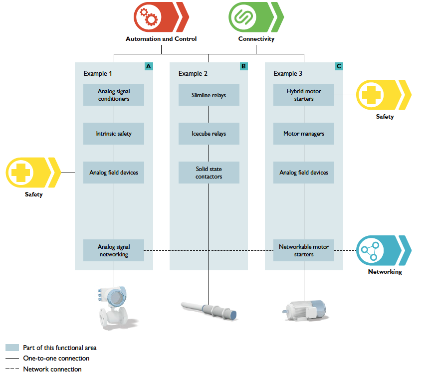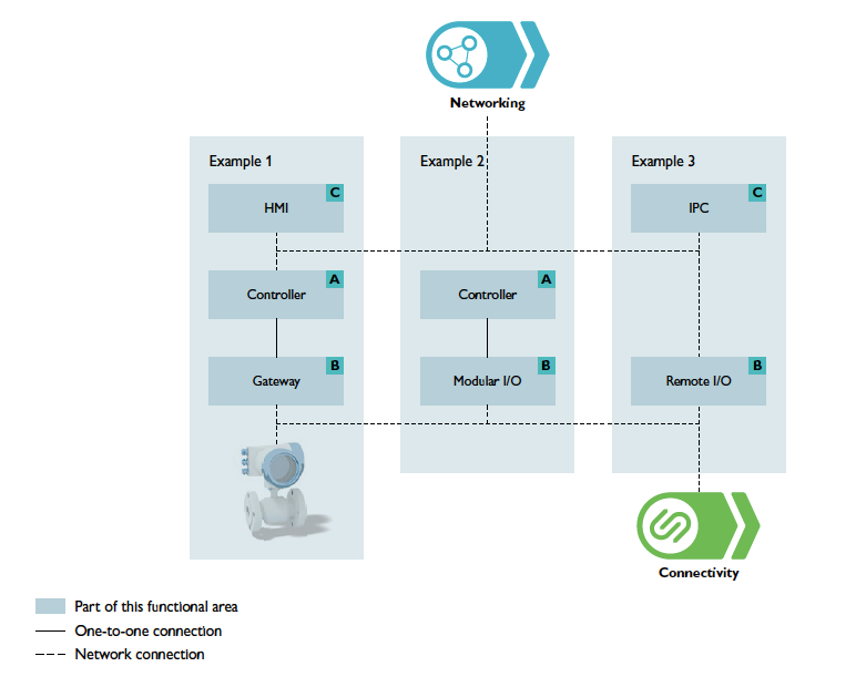 In Figure 6, example 1 showcases a PLC connected to a gateway and human-machine interface (HMI). The HMI is incorporated to visualise the operation of a valve, and the gateway offers network connectivity to legacy devices.