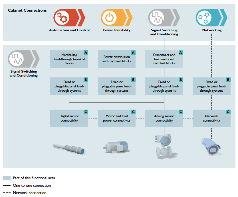 Figure 2 highlights the diversity of connectivity considerations inside a cabinet. Wired connections to production assets, host computer servers, sensors, and actuators must be connected in the panel building process. Power terminations and connections also need to be routed through to those items too. There will be a wide variety of different voltages and currents carried by a range of cable sizes. Some wires may be screened to preserve signal integrity and need terminating accordingly. Sensor cables may involve analogue or digital signals. To acquire digital signals, check Phoenix Contact I/O terminal module, designed to use within an inline station.