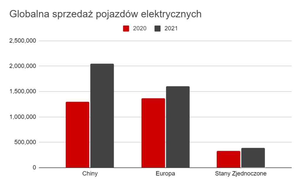 Dzięki wysokim wynikom sprzedaży w 2020 roku Europa wyprzedziła Chiny pod względem wielkości rynku EV na świecie. Gdybyśmy więc zdefiniowali EV jako pojazdy akumulatorowo-elektryczne (BEV) i hybrydy plug-in, Europa wyprzedziła Chiny w sprzedaży EV. Natomiast jeśli chodzi o ogólnoświatową sprzedaż i wdrażanie pojazdów elektrycznych, prym wiodą niewątpliwie Chiny. Po chińskich drogach jeździ ponad połowa wszystkich pojazdów elektrycznych na świecie.