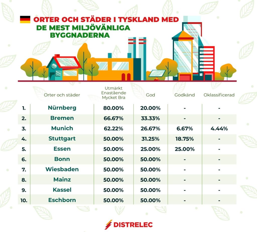 Nürnberg är den näst största staden i Bayern efter München, men även om området är mindre, har den fler byggnader i toppkategorin där 80% av dem uppfyller dessa kriterier. Huvudstaden berättar en något annorlunda historia, och placerade sig på tredje plats i vår studie med 62,22%.