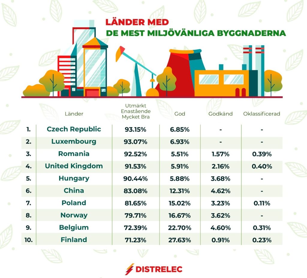Med så många engelska platser som rankas så högt kan man tro att Storbritannien lätt skulle toppa listan över länder med de mest miljövänliga byggnaderna under BREEAMS-betyg. Men även om de får imponerande resultat totalt sett, med 91,53% av dessa byggnader som hamnar i toppkategorierna, smyger de sig bara in bland de fyra bästa där Tjeckien kniper förstaplatsen med 93,15% av sina betygsatta byggnader i den högsta klassificeringen. Kanske mer förvånande, vid en nationell översikt, kom 0,40 % av Storbritanniens byggnader som genomförde BREEAM-bedömningen ut som Oklassificerade.