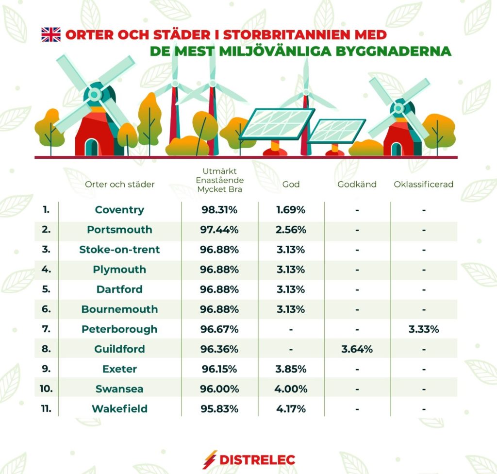 De orter och städer i Storbritannien som har rankats högst för sina Utmärkta, Enastående och Mycket bra byggnader vid sidan av Coventry är Portsmouth, hamnstaden och flottbasen på Englands sydkust, staden Stroke-on-Trent och ytterligare en hamnstad, Plymouth. Intressant nog är tre av städerna på topplistan kuststäder på sydkusten, vilket kan bero på att de ligger i närheten av gröna initiativ som vindkraftsparker.