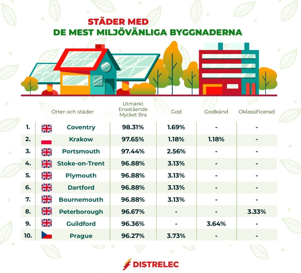 Av de många globala orter och städer som data samlades in från kom Coventry i centrala England överst med hela 98,31% av byggnaderna certifierade av BREEAM som hamnade i kategorin Enastående/Utmärkt/Mycket Bra med ytterligare 1,69% som kom in som Bra. Coventry, ett före detta industriellt kraftverk, skadades kraftigt under andra världskriget och har gjort stora investeringar och omstruktureringar under efterkrigsåren, och blivit en känd universitetsstad, vilket kan förklara hur de får så högt betyg.