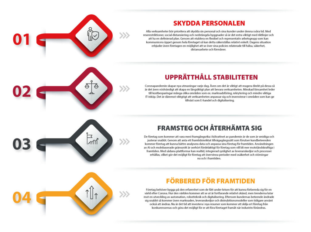 De strategier som er verksamhet implementerar idag kommer att påverka hur framgångsrikt ert företag kommer vara i uppvaknandet efter Coronapandemin. För att säkerställa fortsatt framgång efter denna tid av osäkerhet så bör verksamheten följa dess steg.