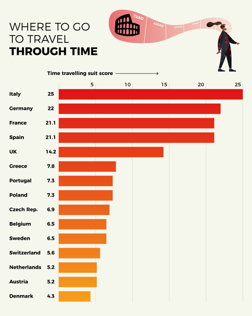 Time travelling haptic suit experiences ranked in first position in terms of the technology that budding travellers were most excited for, and Italy, perhaps unsurprisingly, ranked highest for suitability due to the abundance of culture and history originating from the country. As the homeland of the Romans and often touted as one of the cornerstones of human civilisations, the country is home to historical landmarks and wonders such as the Colosseum, built between 70 and 72 AD. Areas like Rome would offer groundbreaking ‘time travelling’ experiences that allow visitors to experience the city how it was, rather than just seeing landmarks of previous civilisations. Shockingly, Greece doesn’t quite live up to Italy’s ranking, placing 6th, despite the fact that many may argue Greece’s historical superiority in terms of ancient times and influence.
