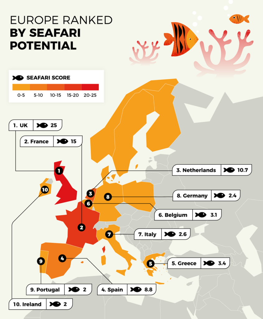 Perhaps one of the less surprising results, France came in second position for potential sea-fari excursions. The country is home to 5,000 km of coastline, the Atlantic Ocean and Mediterranean Sea, and the first marine national park in Europe that have the opportunity to offer travellers new underwater adventures. Some of the highlights include the Calanques National Park, close to Marseille and offering up two historical shipwrecks within recreational diving depths, as well as caverns covered with Mediterranean red coral, and various spots throughout the French Riviera.