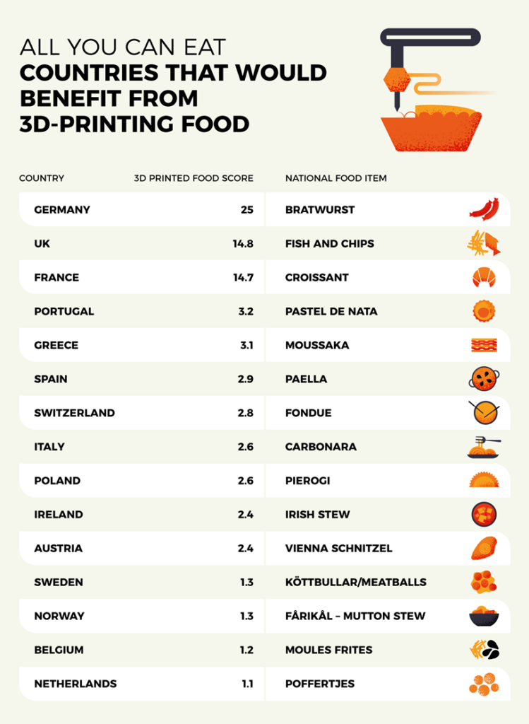 Third position was taken by France, which closely followed the UK with a score of 0.05 less: 14.72, before the countries that followed dipped to scores of 3 and below. In 2020, the food and restaurant sector in France saw a wastage rate of 1,096,000 tonnes, a figure that could potentially be avoided through the implementation of 3D-printing food. This would allow customers to not only choose what they wish to eat, but also in what quantities, with significant numbers of food being wasted through leftovers from customer meals. This wastage figure is the equivalent of 12,894,117,647 croissants (one croissant: 85g).